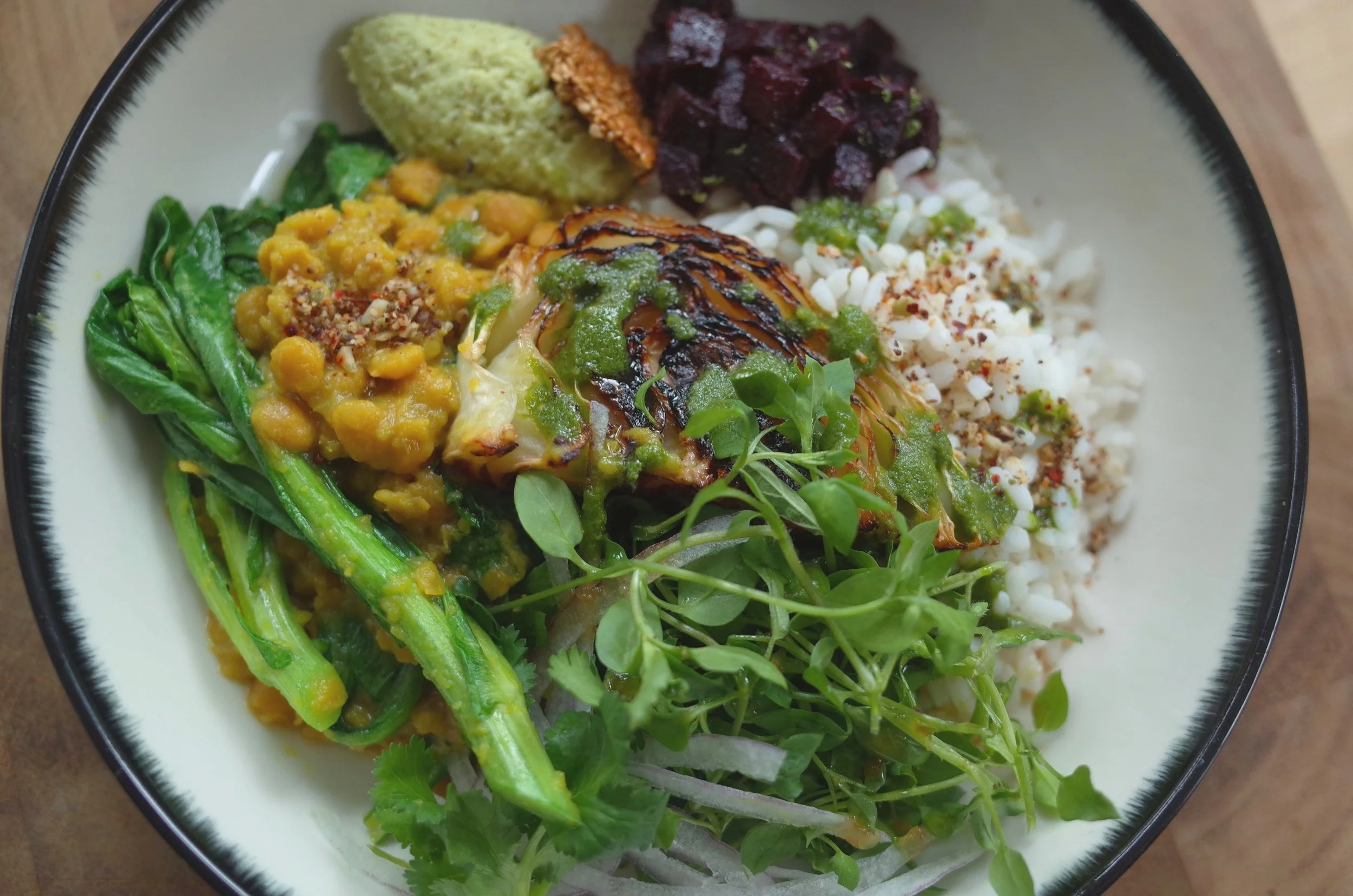 seasonal vegetables, grains, pulses, herbs, spices & condiments combined in creative ways